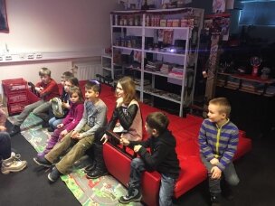 Там на дітей чекали наші неймовірні Іра і Костя, які розказали про історію виникнення мультика, показали як їх роблять і змонтували власний маленький мультик, який малювали діти! А ще було багато цукерок і смачнючок!